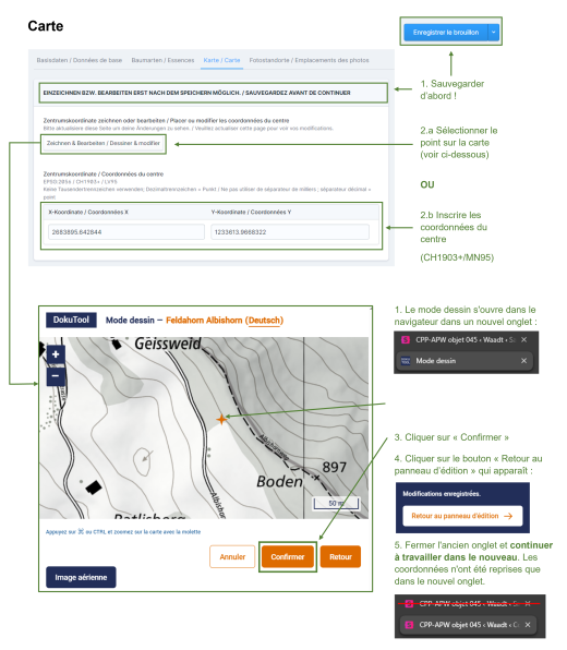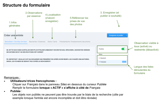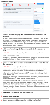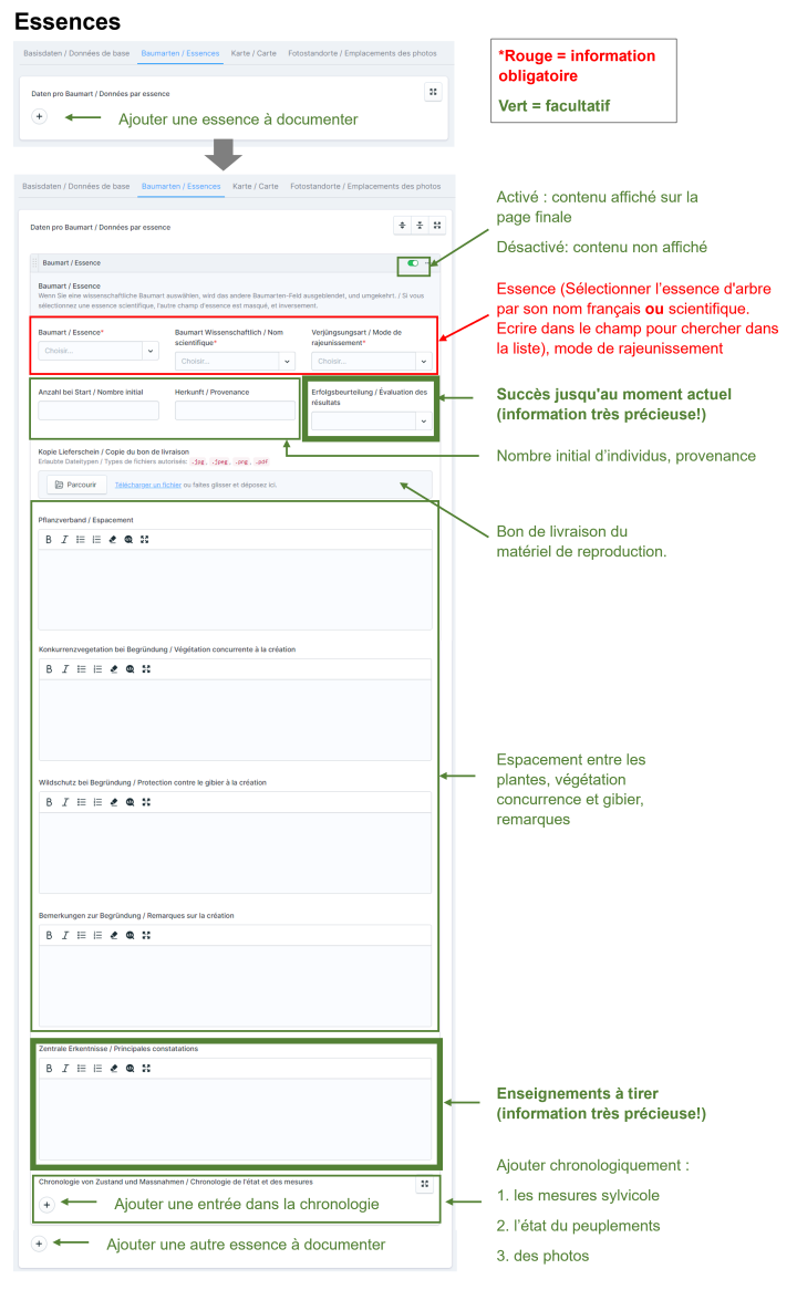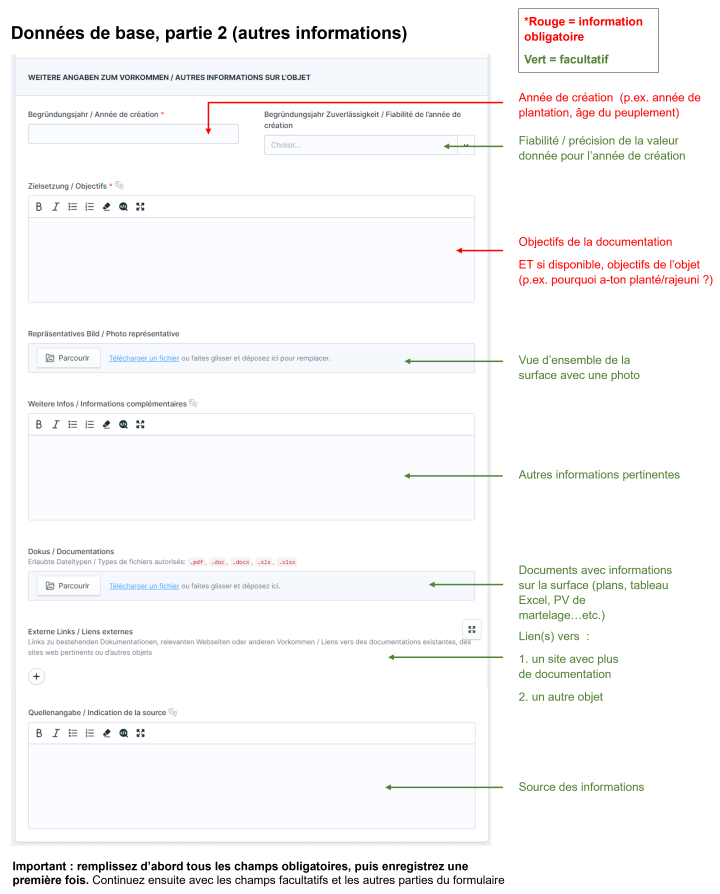 Il est recommandé, autant que possible, de ne pas laisser les champs vides, mais de les remplir même si rien de particulier ne s'est passé ou si quelque chose n'est pas connu. Par exemple : « Provenance : inconnue », « Causes de dépérissement : inconnues », ou « Protection contre le gibier : aucune », plutôt que de laisser les champs vides.