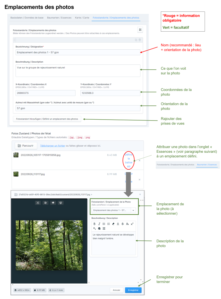 Une fois qu’un emplacement de photos a été créé, il est possible de lui rattacher des photos qui seront déposées dans les entrées chronologiques des essences. Cela se fait dans l’onglet Essences (voir image de droite, partie inférieure).