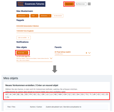Retournez à votre compte et cliquez sur « nouvel objet » pour créer un nouvel objet. Sélectionnez ensuite le canton dans lequel se trouve l'objet.