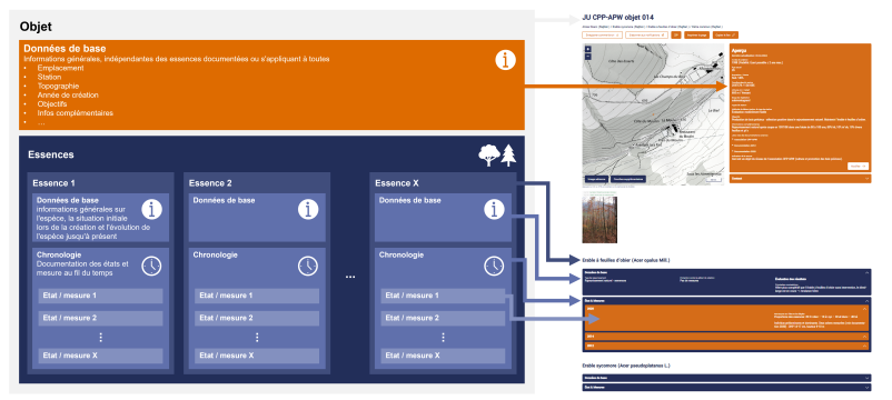 Les données de chaque essence se composent de données de base et d'une chronologie. Les données de base sont des informations générales sur l'espèce, la situation initiale lors de la création et l'évolution de l'espèce jusqu'à présent (voir image). Dans la chronologie, il est possible de saisir un nombre illimité d'états et de mesures afin de documenter l'évolution de l'espèce d'arbre au fil du temps. Idéalement, un premier état avec des grandeurs dendrométriques et des photos est déjà saisi lors de la création d'un nouvel objet.